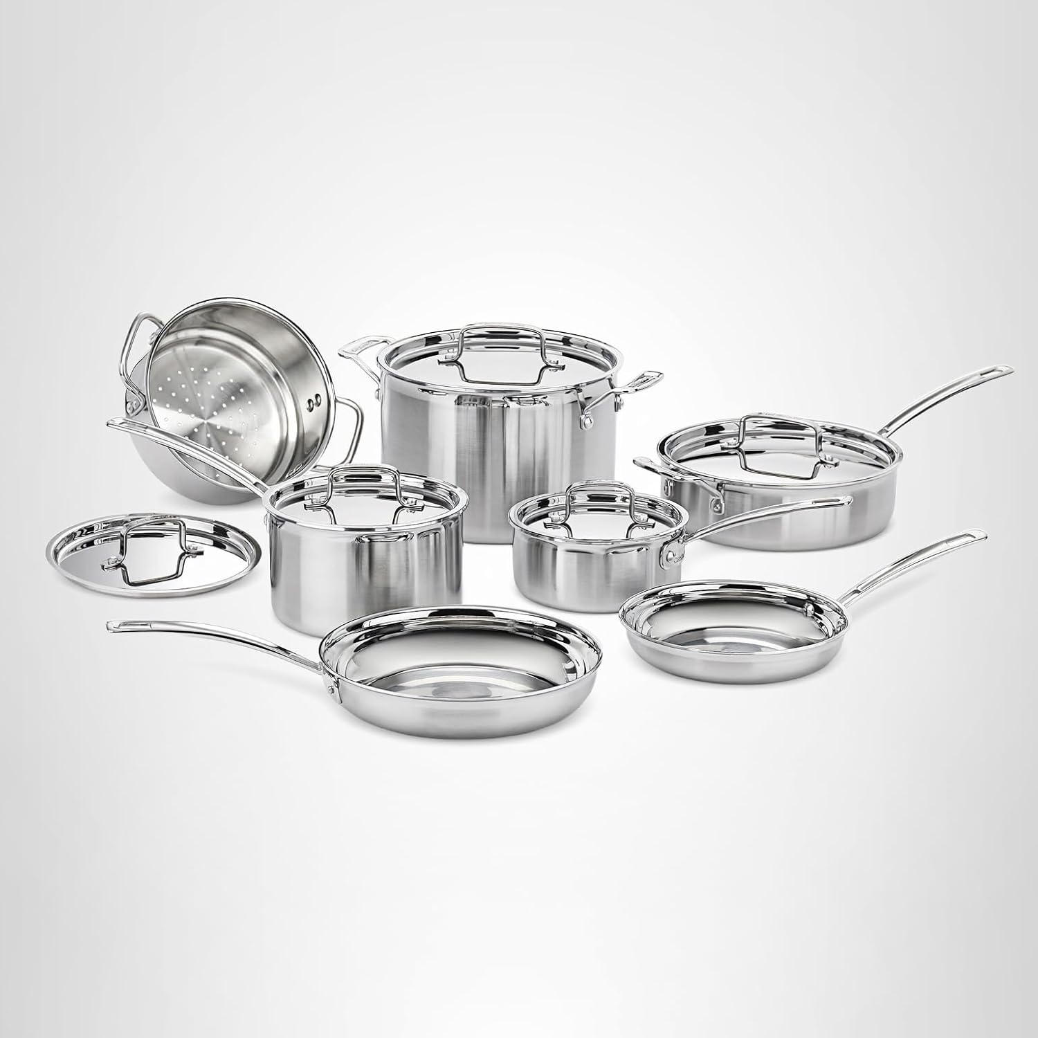 • COOKWARE SET: The Cuisinart 12-Piece Cookware Set includes a 1.5-quart saucepan with lid, 3-quart saucepan with lid, 3.5-quart sauté pan with helper handle and lid, 8-quart stockpot with lid, 8″ skillet, 10″ skillet, and 20cm steamer insert with lid.